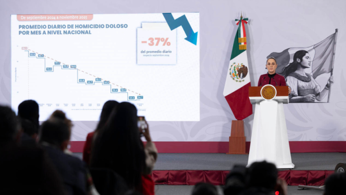 La presidenta Claudia Sheinbaum Pardo resaltó este martes una importante reducción del 37 por ciento en homicidios dolosos diarios en México, de 86.9 en septiembre de 2024 a 54.7 en noviembre de 2025. Esto equivale a 32 víctimas menos al día y marca el mes más bajo desde 2015.