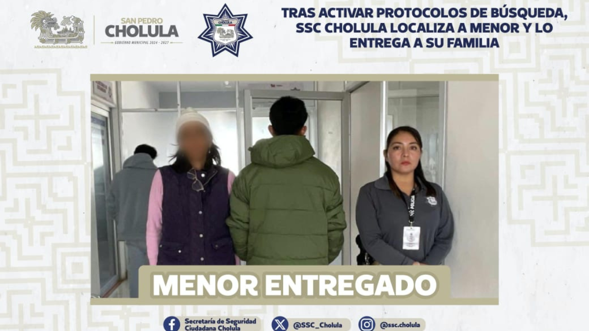 Policías municipales de la Secretaría de Seguridad Ciudadana (SSC Cholula) localizaron a un menor reportado como desaparecido, luego de activar de manera inmediata los protocolos de búsqueda en San Pedro Cholula.