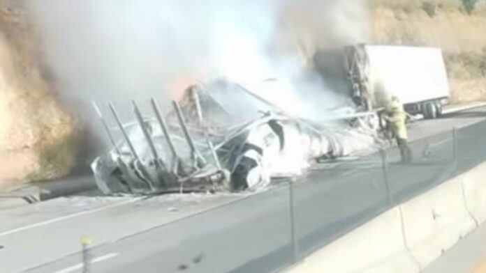 El accidente se registró a la altura del kilómetro 213, donde testigos señalaron que el conductor no se percató de la presencia del otro vehículo, lo que provocó el impacto y el posterior incendio que consumió gran parte de la cabina.