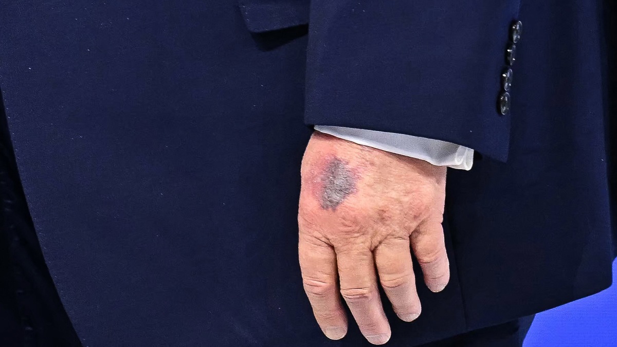 Trump's *left* hand — not the one that is usually disfigured — now has a large bruise and is discolored