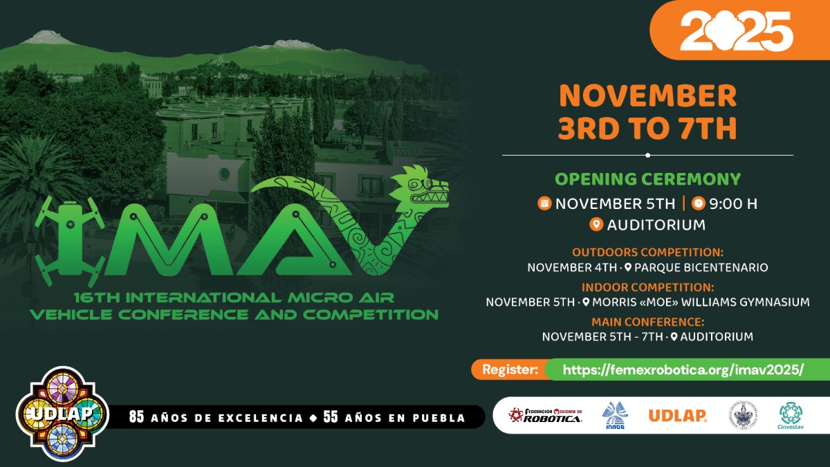 Cabe recordar que El International Micro Air Vehicle Conference and Competitions (IMAV 2025) se realizará del 3 al 7 de noviembre, teniendo como sede principal a la Universidad de las Américas Puebla, institución que está al pendiente de poder brindar las facilidades para realizar este evento, que no solo pondrá a los participantes a trabajar, también será una estupenda oportunidad para los estudiantes de la UDLAP de acercarse a los avances tecnológicos entorno a los drones, sistemas de video y de programación, ello como forma complementar lo que aprenden dentro de su programa de estudios correspondientes a las licenciaturas, que forman parte de la Escuela de Ingeniería de la mejor universidad privada de México: La UDLAP.