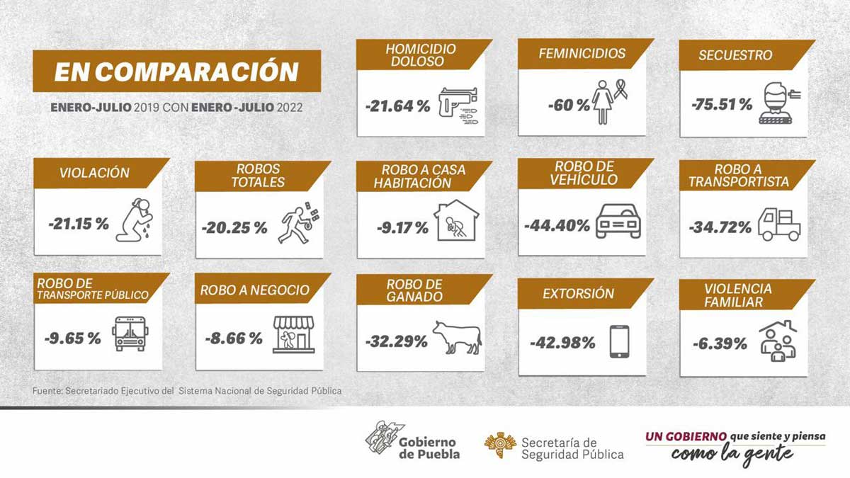 Asimismo, gracias al seguimiento que da el gobernador Miguel Barbosa Huerta, se mantienen a la baja delitos como robo de vehículo (-44.40%), extorsión (-42.98%), robo a transportista (-34.72%), robo de ganado (-32.29%) homicidio doloso (-21.64%), violación simple (-21.15%), robos totales (-20.25%), robo en transporte público (-9.65%), robo a casa habitación (-9.17%), robo a negocio (-8.66%) y violencia familiar (-6.39%).
